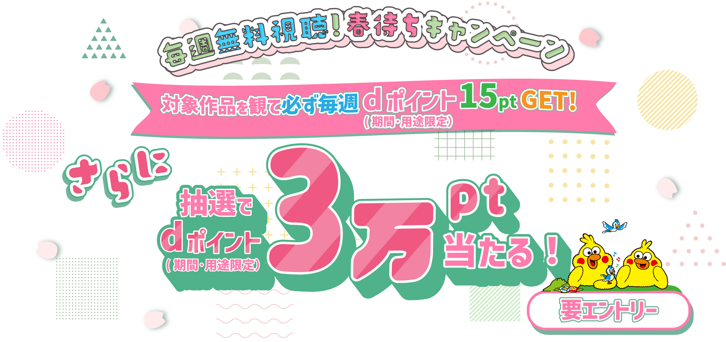 株式会社NTTドコモ(以下「当社」といいます)が実施する「毎週無料視聴!春待ちキャンペーン」(以下「本キャンペーン」といいます)は、この規約(以下「本規約」といいます)に従って実施されます。 ご応募にあたっては、以下の内容をご確認いただき、同意いただいた上でご参加ください。