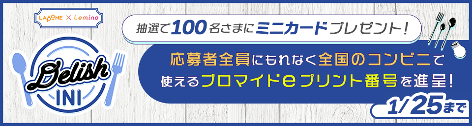 ※都合により賞品の発送時期は前後する場合がございます。あらかじめご了承ください。2.『DELISH INI』ブロマイドeプリント番号 / 応募条件を満たした方全員