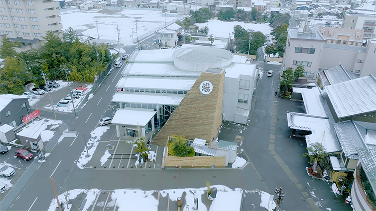 「温泉は天からの水と地のエネルギーの交歓から生まれたもの」というイメージから独創的な2つの「湯」を表現。