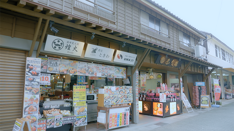 新鮮な魚介類を使った定食や丼、寿司のほか、越前そばやソースカツ丼などご当地グルメも楽しめる飲食店のほか、福井の銘菓や地酒や、若狭塗りや越前焼といった伝統工芸品、東尋坊オリジナルのユニークなTシャツなどが豊富に揃う。