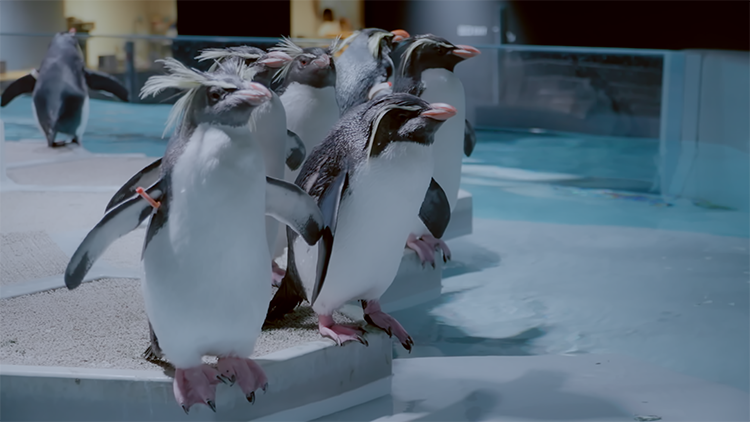 目玉の一つであるペンギンを展示する水槽は、陸地部分が六角形のブロックを組み合わせてできており、ブロックの数や組み合わせを変えることで、環境に変化をもたらすことができる世界初の仕組みを採用している。