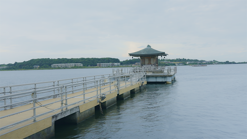 柴山潟の中に立つ珍しい御堂。愛称は「うきうき弁天」。