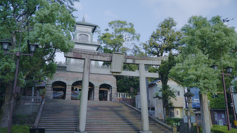 全国的にも珍しい和漢洋の3つの建築様式が用いられた「神門」は金沢市の代表的な観光スポット。国の重要文化財にも指定されており、特に、最上階にはめ込まれたギヤマンは美しく、訪れた人を魅了する。また、日本現存最古の避雷針が施されている。