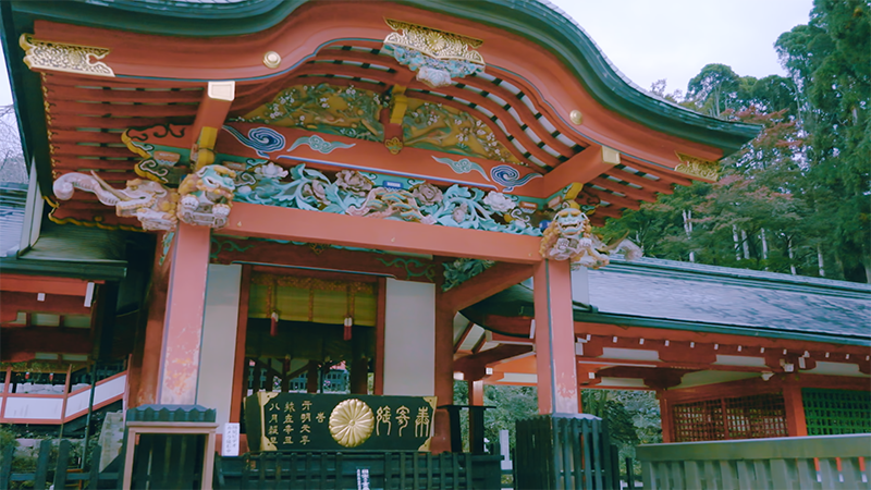 傾斜を利用して建てられた社殿は内部のいたるところまで豪華な装飾がなされていて、建物がそれぞれ国宝と重要文化財に指定されている。