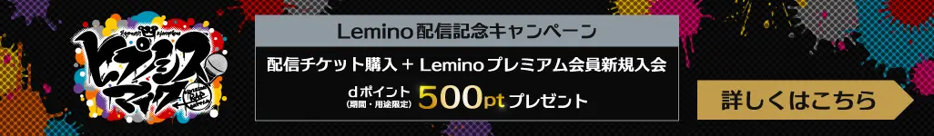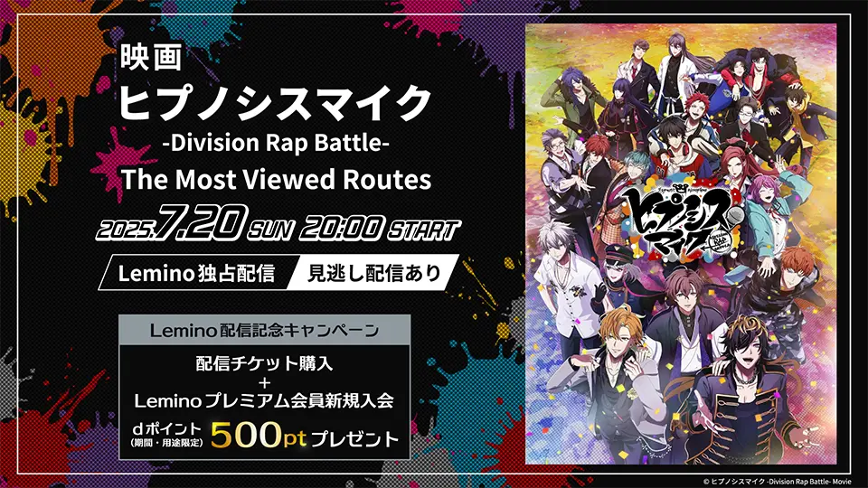 ・「映画「ヒプノシスマイク -Division Rap Battle-」The Most Viewed Routes」の配信チケットの購入とキャンペーン期間中のLeminoプレミアム新規入会で500ptのdポイント(期間・用途限定)を進呈します。