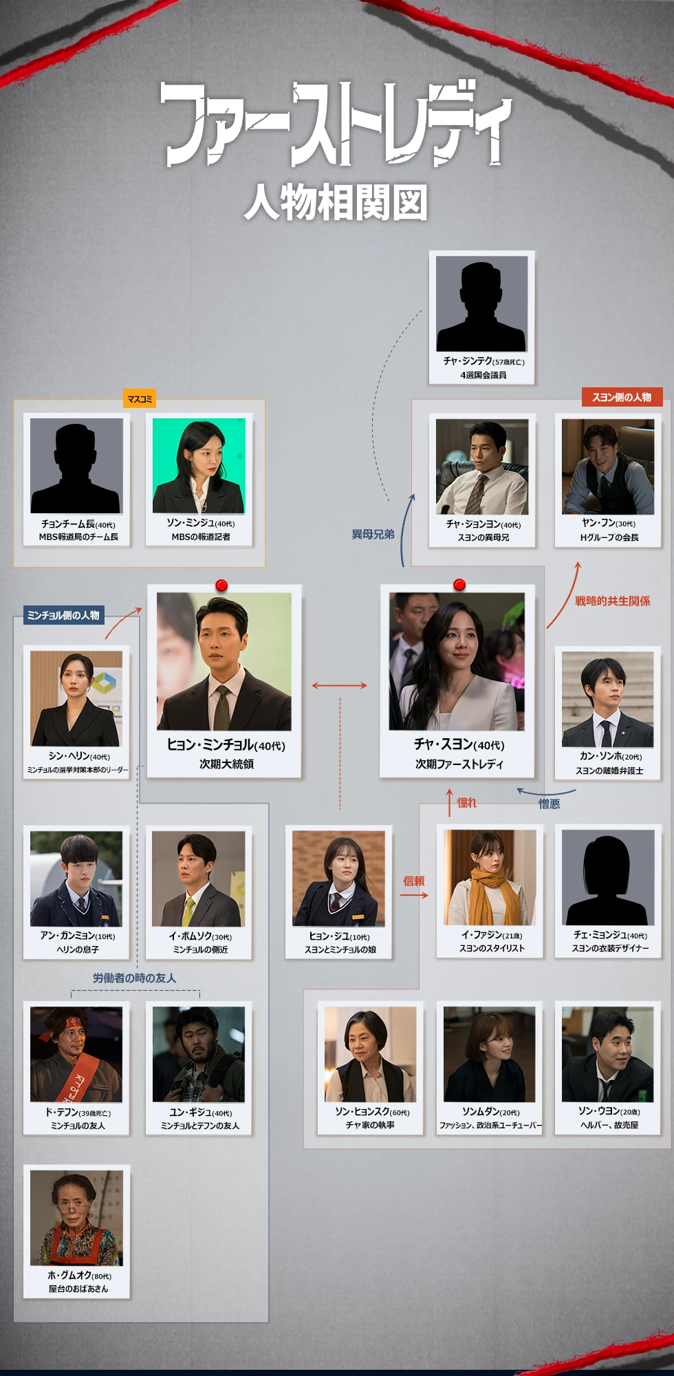 次期大統領夫人 労働者出身の活動家だったミンチョルを大統領にしたキングメーカー。望んでいたファーストレディという夢が叶うと同時に、ミンチョルより離婚を宣言される。世間を揺るがす離婚訴訟の中、スヨンはファーストレディの座を守ろうとする。